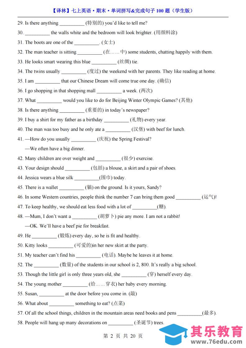 七年级上英语期末单词拼写完成句子100题(译林版)中小学资料库2年前发布关注私信3615七年级上英语期末单词拼写完成句子100题(译林版)此内容为免费资源,请登录后查看¥0限时特惠¥99 登录查看免费资源 ——预览已结束,还剩18页未读——您已获得此文档下载权限,请点击底部下载完整文档 © 版权声明文章版权归作者所有,未经允许请勿转载。THE END七年级# 英语# 七年级 喜欢就支持一下吧点赞15 分享QQ空间微博QQ好友海报分享复制链接收藏
