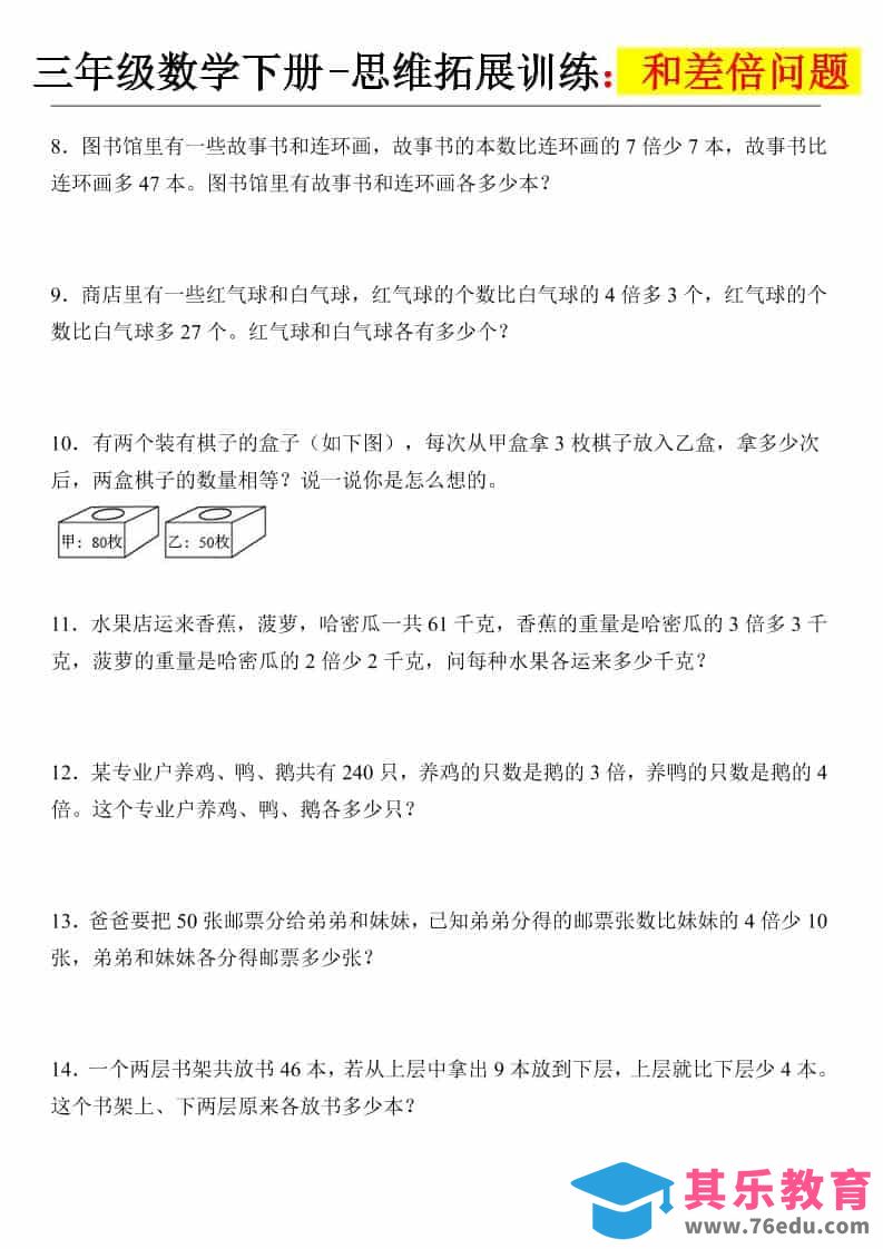三年级下数学思维拓展训练-和差倍问题中小学资料库1小时前发布关注私信3912三年级下数学思维拓展训练-和差倍问题此内容为免费资源,请登录后查看¥0限时特惠¥99 登录查看免费资源 ——预览已结束,还剩13页未读——您已获得此文档下载权限,请点击底部下载完整文档 © 版权声明文章版权归作者所有,未经允许请勿转载。THE END三年级# 数学# 三年级 喜欢就支持一下吧点赞12 分享QQ空间微博QQ好友海报分享复制链接收藏