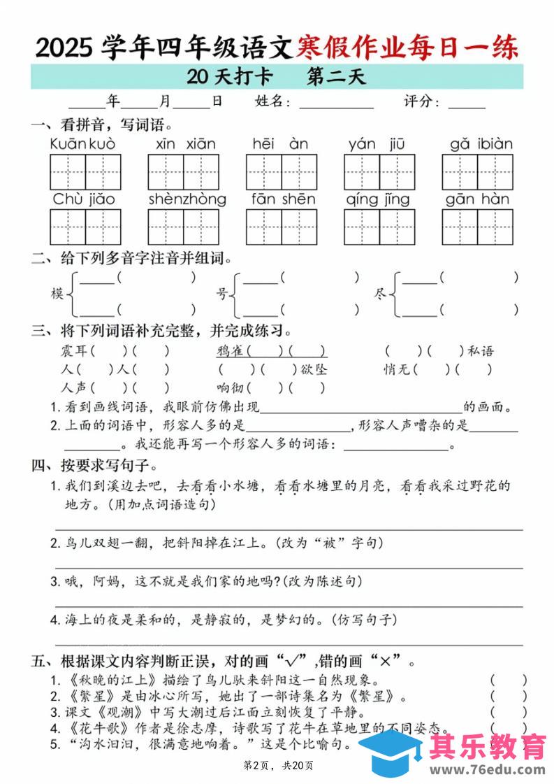 四年级语文下寒假作业每日一练20天(20页)中小学资料库3小时前发布关注私信5014四年级语文下寒假作业每日一练20天(20页)此内容为免费资源,请登录后查看¥0限时特惠¥99 登录查看免费资源 ——预览已结束,还剩18页未读——您已获得此文档下载权限,请点击底部下载完整文档 © 版权声明文章版权归作者所有,未经允许请勿转载。THE END四年级# 语文# 四年级 喜欢就支持一下吧点赞14 分享QQ空间微博QQ好友海报分享复制链接收藏