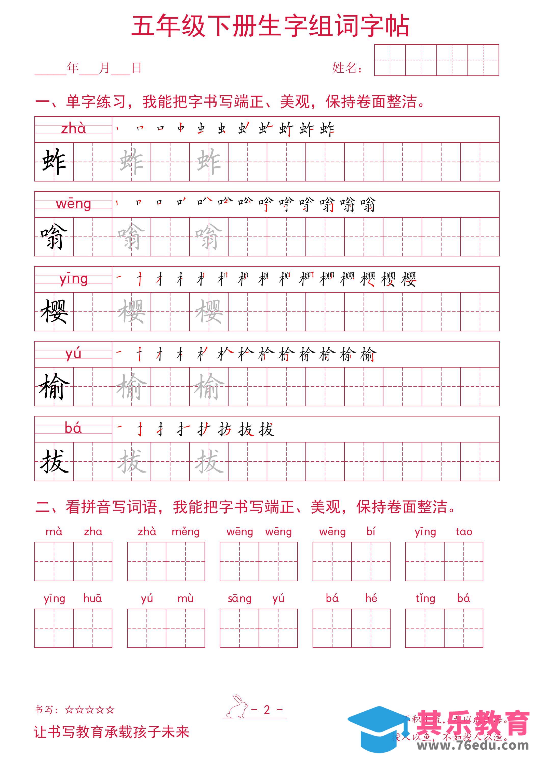 五年级下册语文生字组词字帖中小学资料库1年前发布关注私信5010五年级下册语文生字组词字帖此内容为免费资源,请登录后查看¥0限时特惠¥99 登录查看免费资源 ——预览已结束,还剩34页未读——您已获得此文档下载权限,请点击底部下载完整文档 © 版权声明文章版权归作者所有,未经允许请勿转载。THE END五年级# 语文# 五年级 喜欢就支持一下吧点赞10 分享QQ空间微博QQ好友海报分享复制链接收藏